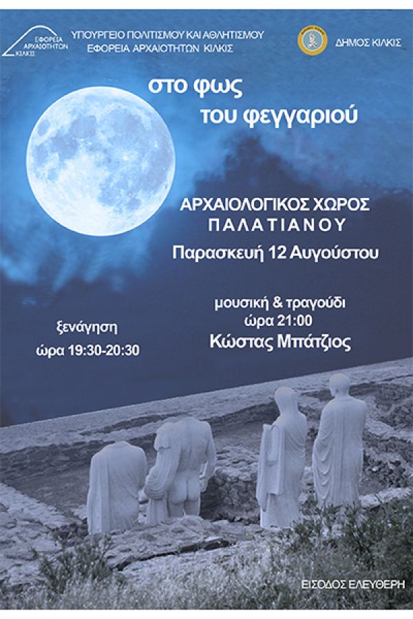 Την Παρασκευή 12 Αυγούστου, η Εφορεία Αρχαιοτήτων Κιλκίς - σε συνεργασία με τον Δήμο Κιλκίς - συμμετέχουν στον ετήσιο εορτασμό της Αυγουστιάτικης Πανσελήνου του Υπουργείου Πολιτισμού και Αθλητισμού και διοργανώνουν την εκδήλωση «Στο Φως του Φεγγαριού» στον αρχαιολογικό χώρο Παλατιανού.