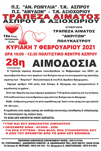 Με την είσοδο στο 15ο έτος διοργανώνεται η 28η εθελοντική αιμοδοσία την Κυριακή 7 Φεβρουαρίου 2021 από τις 10:00 – 12:30 στο Πολιτιστικό κέντρο Άσπρου.