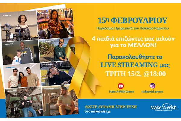 Στις 15 Φεβρουαρίου, γιορτάζουμε το θάρρος, τον αγώνα και το μέλλον των παιδιών που παλεύουν και σας προσκαλούμε να παρακολουθήσετε την εξέλιξη της υγείας και της ζωής τεσσάρων παιδιών μας, ενώ εκείνα παράλληλα θα μας μεταφέρουν το αισιόδοξο μήνυμα της επιβίωσης από τον καρκίνο. Η Γεωργία, η Κατερίνα, ο Άγγελος και ο Γιάννης, έχουν ενηλικιωθεί, έχουν ακολουθήσει ιατρικά επαγγέλματα και έχουν παραμείνει εθελοντές μας. Ο καθένας τους έχει μία μοναδική ιστορία να μοιραστεί σχετικά με την επίδραση της ευχής στη ζωή του, και αυτό θα συμβεί μέσα από ένα μοναδικό live streaming στο Instagram του Make-A-Wish Ελλάδος στις 15 Φεβρουαρίου, στις 18:00. Τη συζήτηση θα συντονίσει ο επιστημονικός σύμβουλος του οργανισμού, και Διευθυντής του Τμήματος Παιδιατρικής Αιματολογίας - Ογκολογίας του ΕΛΠΙΔΑ, Dr Βασίλειος Παπαδάκης. Από το live streaming δεν θα λείψουν και οι εθελοντικές εμπειρίες ανθρώπων που έχουν βιώσει την θεραπευτική δύναμη της εκπλήρωσης μίας ευχής.