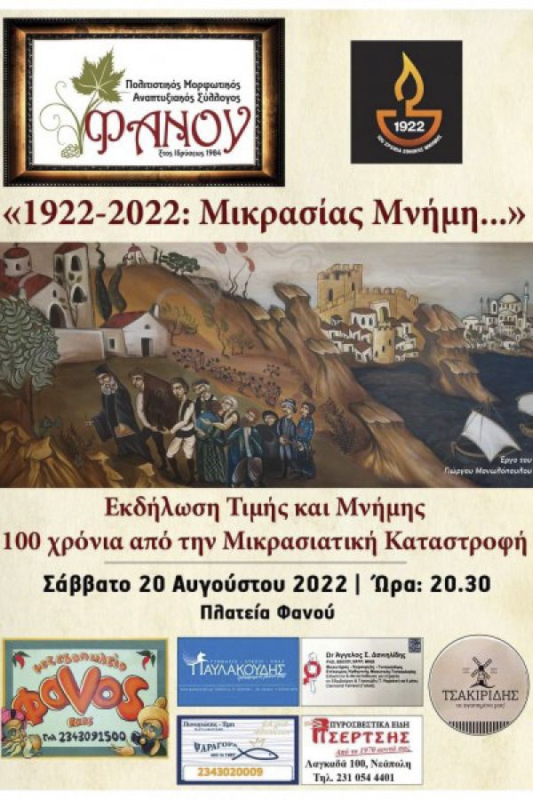Η εκδήλωση είναι αφιερωμένη στη μνήμη όλων των θυμάτων της Καταστροφής, καθώς και σε όλους τους προγόνους μας, που ήρθαν κι εγκαταστάθηκαν στο Φανό ως πρόσφυγες από τη Μεσόπολη της Βιθυνίας και από τα Πέρματα του Ικονίου της Καππαδοκίας.