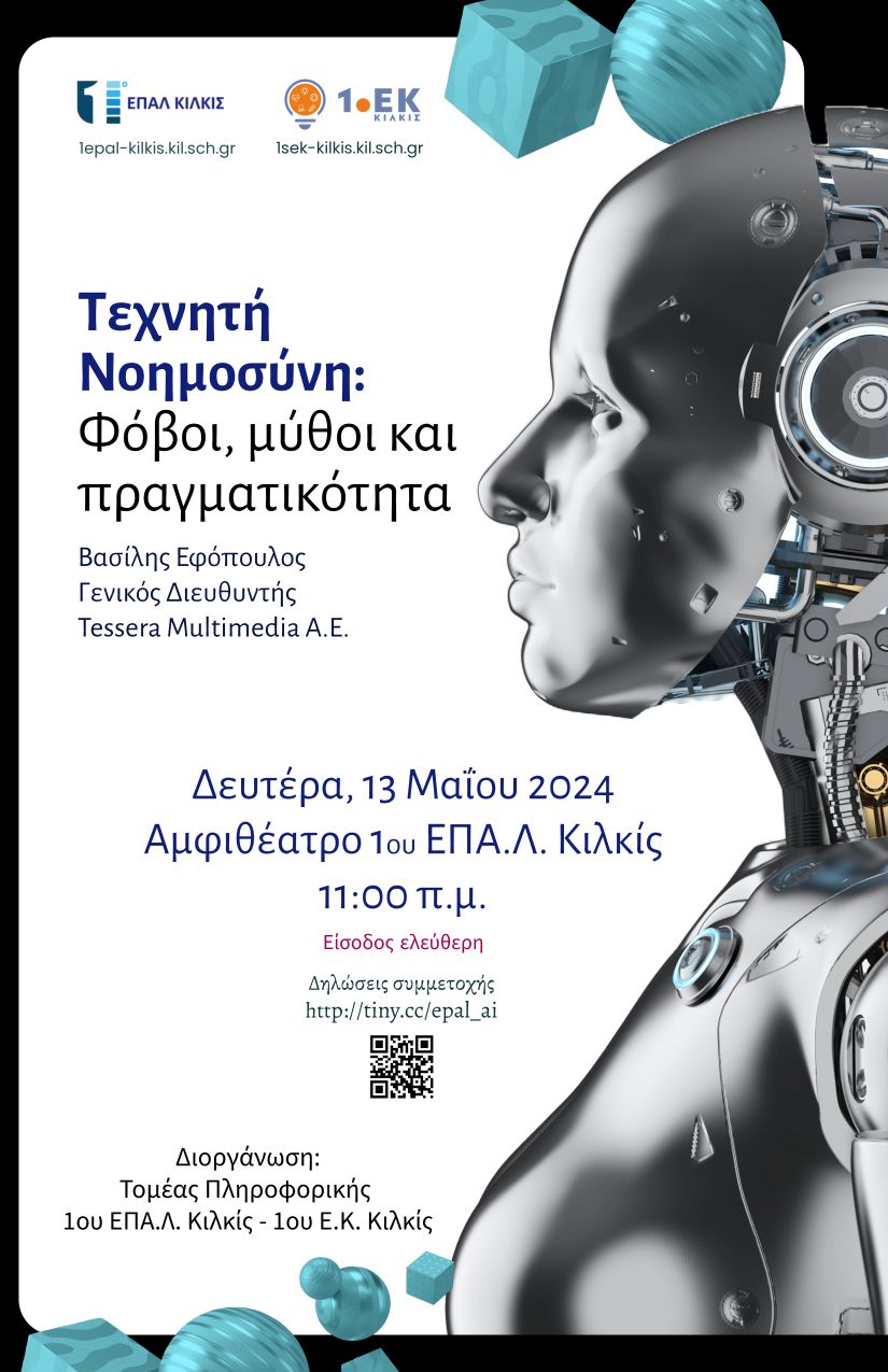 Ο Τομέας Πληροφορικής του 1ου ΕΠΑ.Λ. Κιλκίς - 1ου Ε.Κ. Κιλκίς οργανώνει τη Δευτέρα 13 Μαΐου και ώρα 11:00 π.μ., στο αμφιθέατρο του 1ου ΕΠΑ.Λ. Κιλκίς, ομιλία με θέμα: «Τεχνητή Νοημοσύνη: φόβοι, μύθοι και πραγματικότητα».