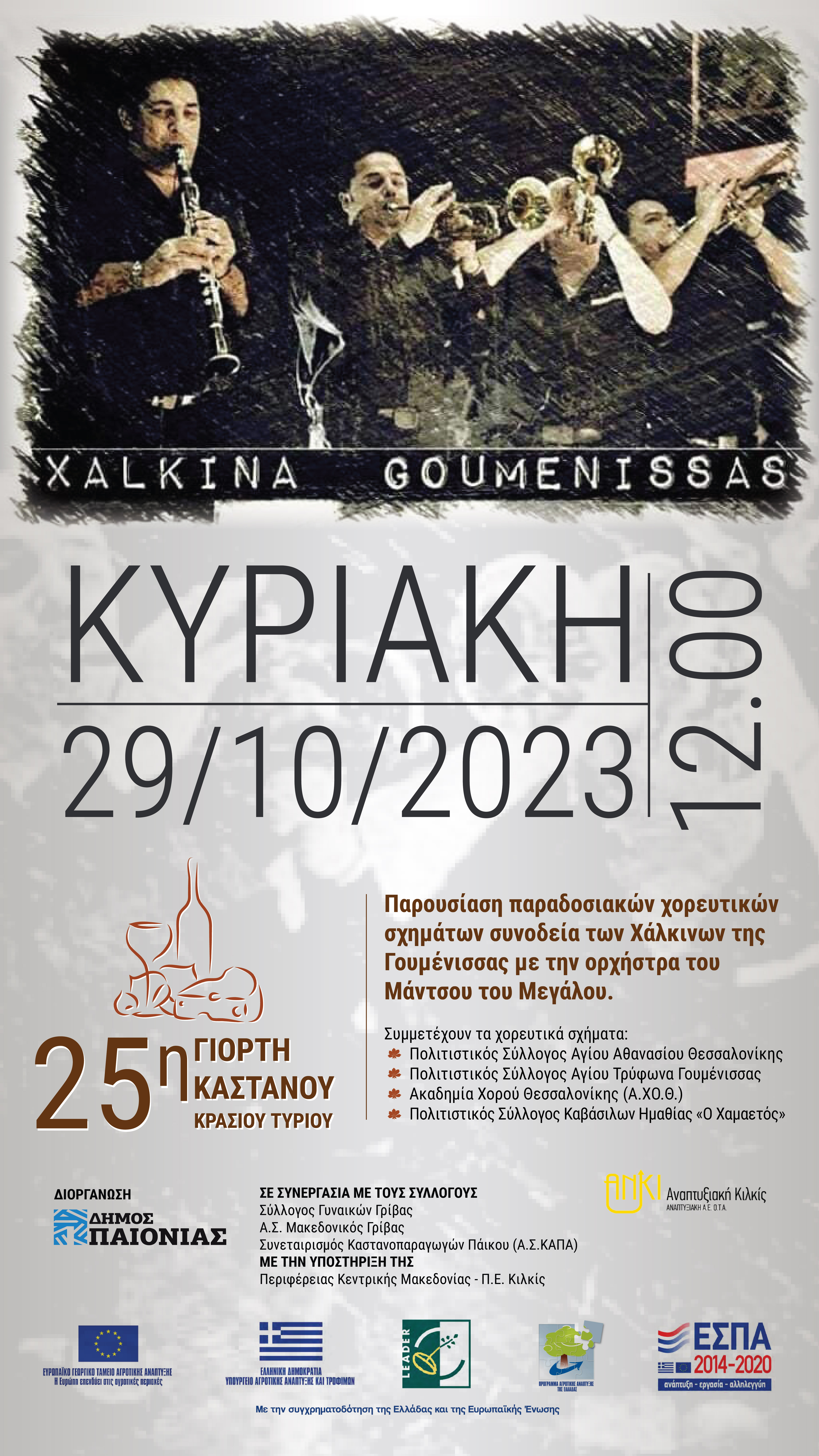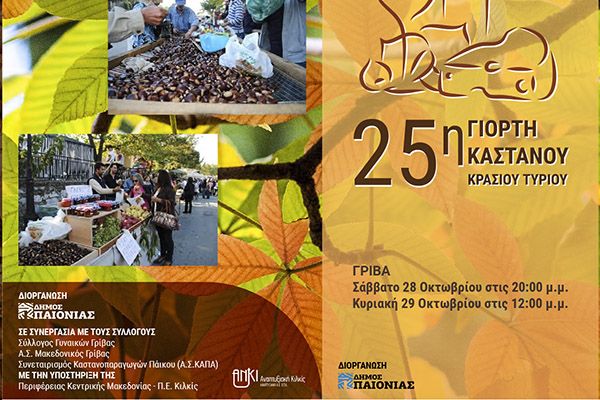 Ο Δήμος Παιονίας, σε συνεργασία με τον Σύλλογο Γυναικών Γρίβα, τον Σύλλογο Μακεδόνων Γρίβα και τον Συνεταιρισμό Καστανοπαραγωγών Πάικου (ΑΣΚΑΠΑ), σας προσκαλεί εγκάρδια να παρευρεθείτε στην 25η Γιορτή Κάστανου, Κρασιού και Τυριού στη Γρίβα.