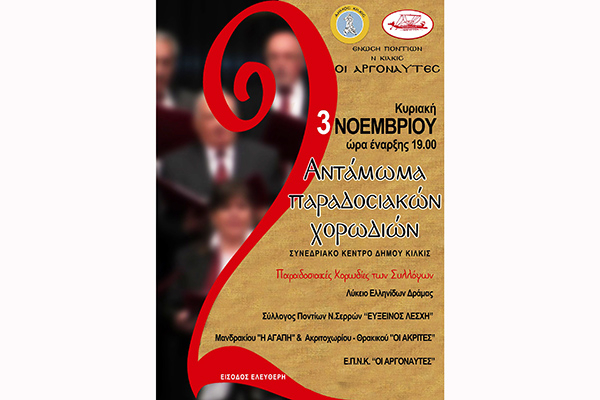 3 Νοεμβρίου 2019 και στο Συνεδριακό κέντρο του Δήμου Κιλκίς στις 19.00 ανοίγουν οι πόρτες του 2ου Ανταμώματος Παραδοσιακών Χορωδιών που διοργανώνει η Ένωση Ποντίων ν. Κιλκίς "Οι Αργοναύτες", με είσοδο ελεύθερη για το κοινό.