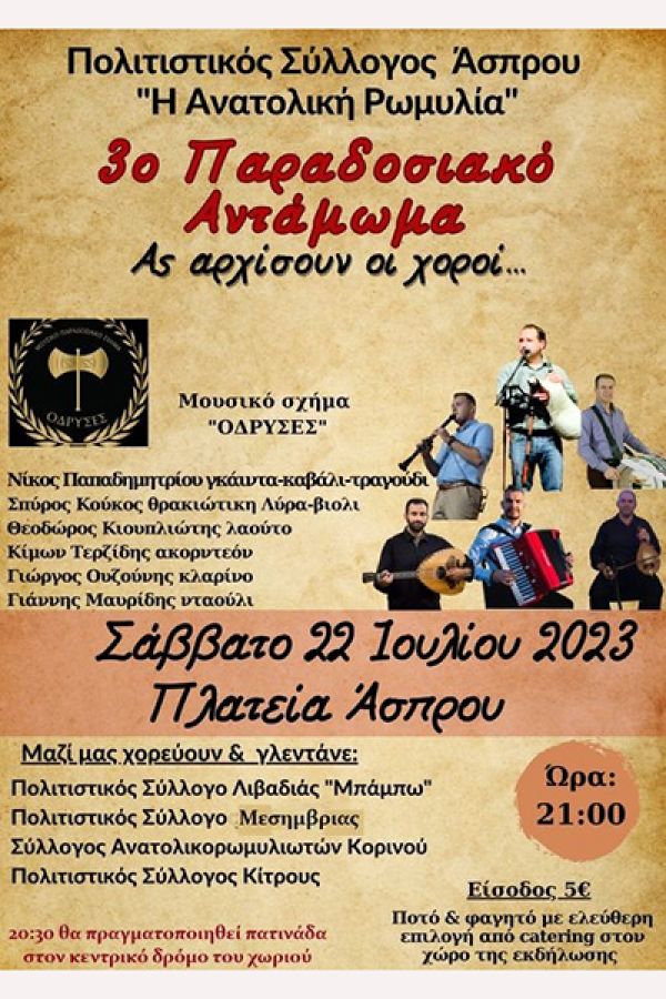 Το 3ο Παραδοσιακό Αντάμωμα οργανώνει στον Άσπρο Κιλκίς ο Πολιτιστικός Σύλλογος Άσπρου "Η Ανατολική Ρωμυλία", το Σάββατο 22 Ιουλίου, στην πλατεία Άσπρου, στις 9 το βράδυ, με το μουσικό σχήμα "ΟΔΡΥΣΕΣ" και πέντε χορευτικά σχήματα.