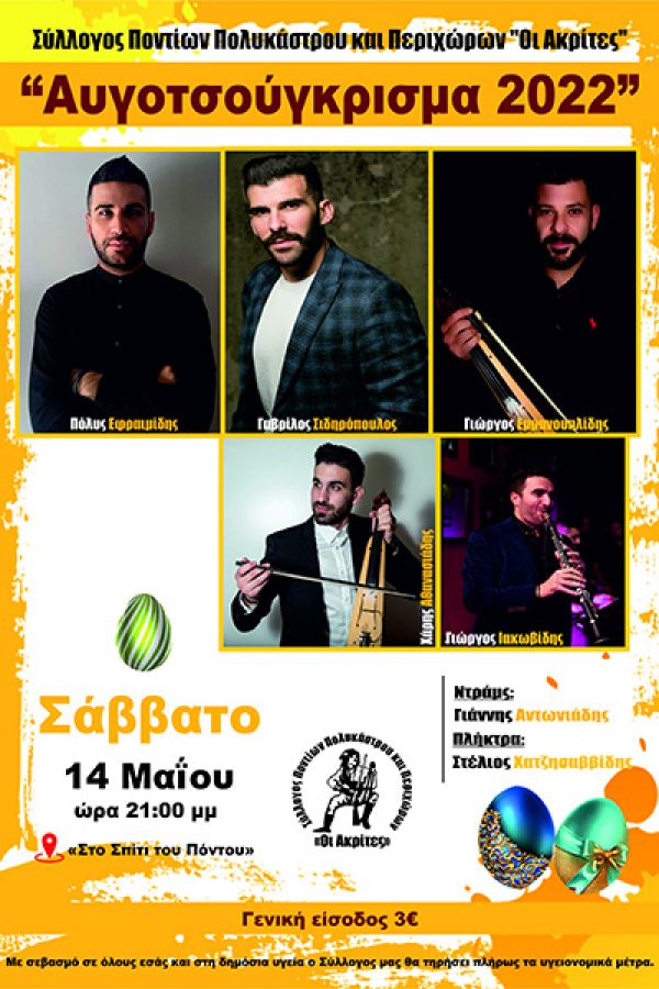 Ο σύλλογός μας πραγματοποιεί τη θεσμική εκδήλωση Αυγοτσούγκρισμα 2022. Η εκδήλωση θα γίνει το Σάββατο 14 Μαΐου 2022 στο «ΣΠΙΤΙ ΤΟΥ ΠΟΝΤΟΥ». Στην εκδήλωση θα παρουσιαστούν τα χορευτικά συγκροτήματα του συλλόγου και θα πραγματοποιηθεί διαγωνισμός αυγοτσουγκρίσματος με πλούσια δώρα για τον νικητή.