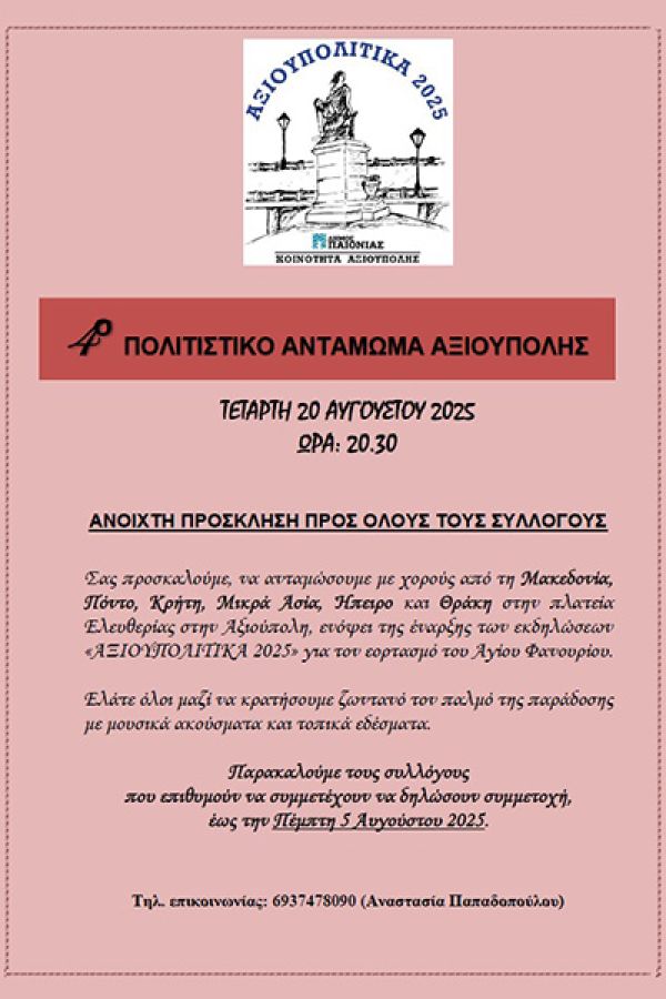Αξιουπολίτικα 2025: Πολιτιστικό αντάμωμα Αξιούπολης  την Τετάρτη 20 Αυγούστου 2025