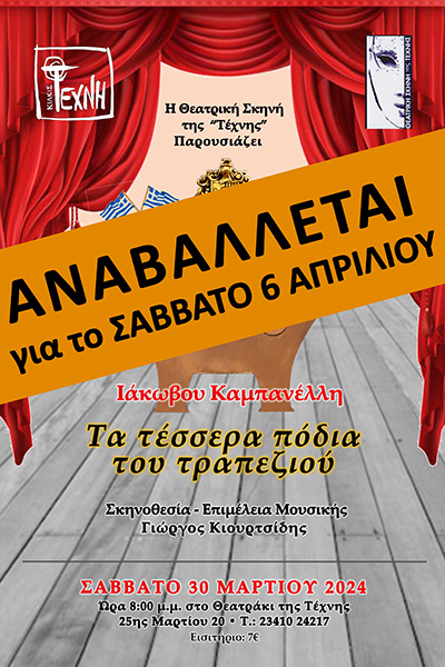 Η προγραμματισμένη για το Σάββατο 30 Μαρτίου παράσταση της θεατρικής σκηνής της ΤΕΧΝΗΣ, με το έργο "Τα τέσσερα πόδια του τραπεζιού" του Ιάκωβου Καμπανέλλη, αναβάλλεται για το ΣΑΒΒΑΤΟ 6 ΑΠΡΙΛΙΟΥ 2024, λόγω ασθένειας των ηθοποιών.