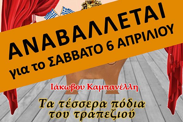 Αναβάλλεται για τις 6 Απριλίου η παράσταση της "Τέχνης" Κιλκίς "Τα τέσσερα πόδια του τραπεζιού"