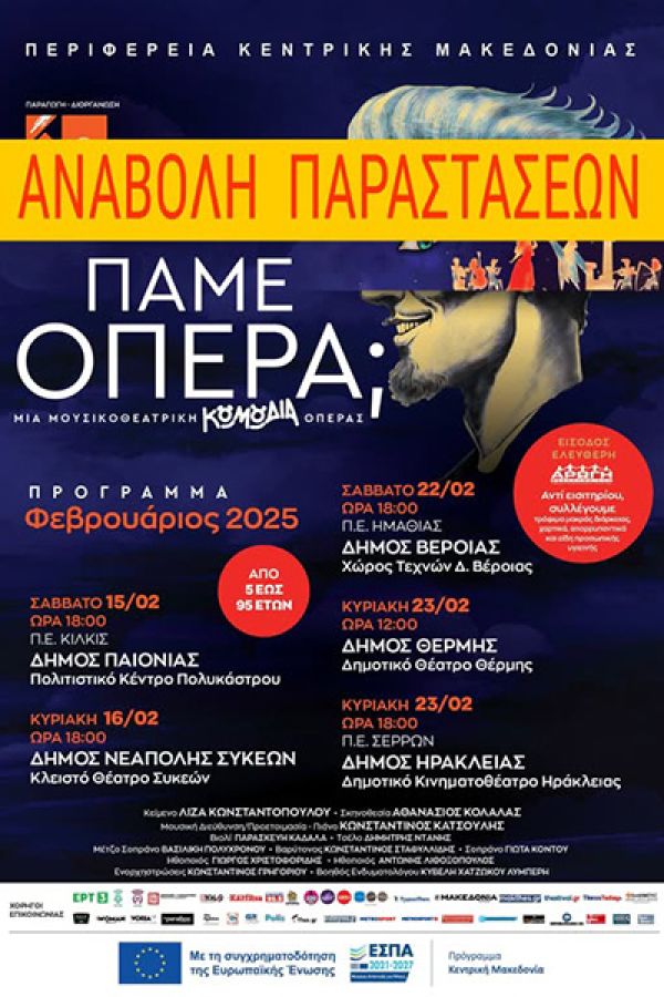 Το Κέντρο Πολιτισμού της Περιφέρειας Κεντρικής Μακεδονίας ανακοινώνει ότι για τεχνικούς λόγους αναβάλλει τις παραστάσεις του εκπαιδευτικού προγράμματος «Πάμε…Όπερα;;» το Σάββατο 15 Φεβρουαρίου ώρα 18:00