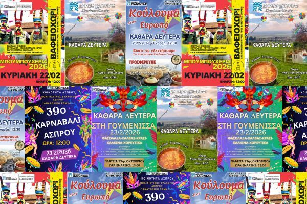 Ο Δήμος Παιονίας προσκαλεί δημότες και επισκέπτες να συμμετάσχουν στις αποκριάτικες και εορταστικές εκδηλώσεις που θα πραγματοποιηθούν σε κοινότητες της περιοχής, με πλούσιο πρόγραμμα, παραδοσιακά δρώμενα και γιορτινή ατμόσφαιρα.