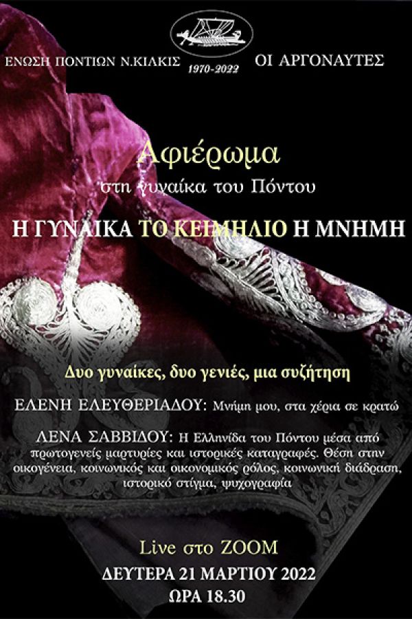 Στο πλαίσιο των εργασιών μας για το επετειακό έτος μνήμης για τα 100 χρόνια από την Μικρασιατική Καταστροφή, έχουμε την τιμή να φιλοξενούμε στην στέγη μας δυο γενεών Πόντιες Κιλκισιώτισσες γυναίκες. Οι κες Λένα Σαββίδου και Ελένη Ελευθεριάδου μας καλούν να ηθογραφήσουμε παρέα την Πόντια Γυναίκα μέσα από τις μνήμες που, είτε ως βιώματα είτε ως ιστορίες, μας μεγάλωσαν. Μέσα από τα κειμήλια: υλικά τε και άυλα, μας προσκαλούν να συμπλεύσουμε μαζί τους στο ιδιαίτερο αυτό αφιέρωμα.