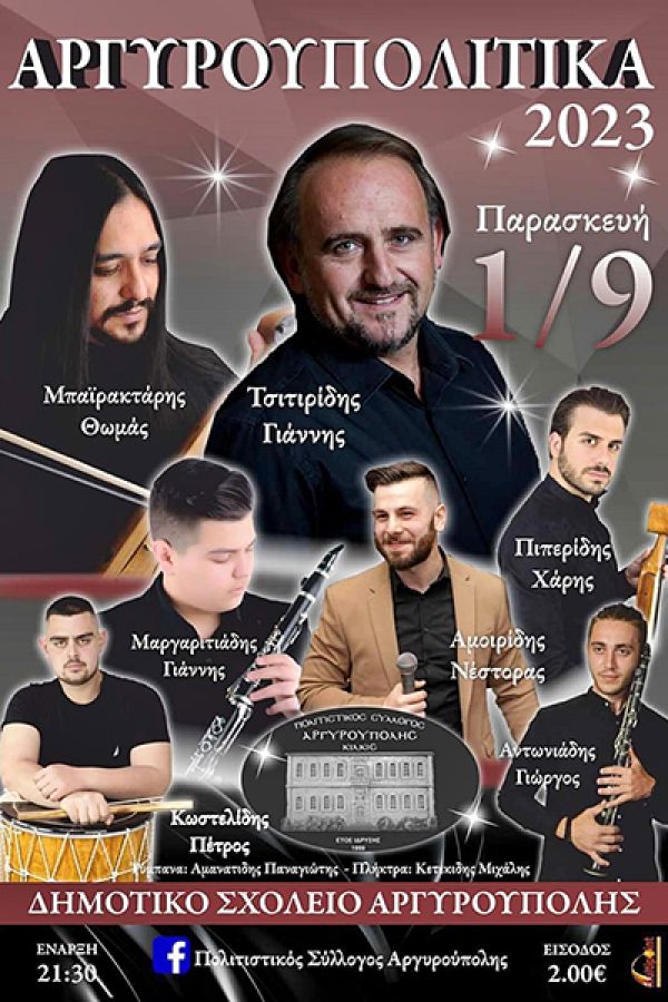 "Αργυρουπολίτικα 2023" την Παρασκευή 1/9 από τον Πολιτιστικό Σύλλογο Αργυρούπολης Κιλκίς, στο Δημοτικό Σχολείο του χωριού, μετά τις 9:30 το βράδυ.