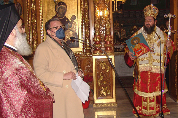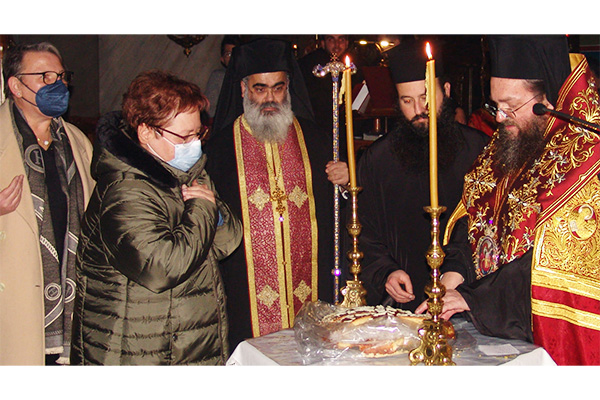 Στο τέλος της Αγρυπνίας καλωσόρισε το νέο Μητροπολίτη Κιλκισίου κ.κ. Βαρθολομαίο, προσφέροντάς του μία εικόνα του Αγίου Ευγενίου του Τραπεζουντίου, αγιογραφημένη από το μέλος του Συλλόγου Μαρία Συμεωνίδου.