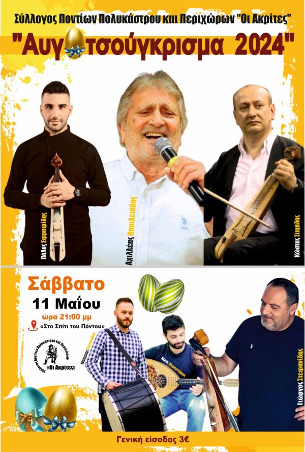 Αυγοτσούγκρισμα 2024 από τους "Ακρίτες" του Πολυκάστρου, το Σάββατο 11 Μαΐου, στις 9 το βράδυ, στο Σπίτι του Πόντου, με πλούσιο καλλιτεχνικό πρόγραμμα.
