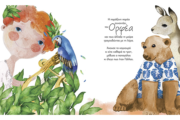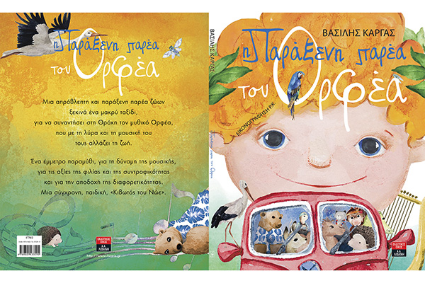 Στο έμμετρο αυτό παραμύθι μου, ο Ορφέας σαγηνεύει με τη λύρα του και το τραγούδι του αγαπημένα ζώα των παιδιών, που ξεκίνησαν ένα μακρύ ταξίδι για να τον συναντήσουν στη Θράκη και τους αλλάζει τη μοίρα: Ένα καγκουρό που δεν έλεγε το ρο, μια καμήλα που μασούσε μόνο μήλα, ένα τζιτζίκι που τρελαινόταν για τζατζίκι, μια αρκούδα συγγραφέα, ένα πελαργό αργό, ένα παπαγάλο Γάλλο, ένα κροκόδειλο δειλό, ένα γάτο καλλιτέχνη, μια χελώνα με μπικίνι, έναν ουρακοτάγκο που χόρευε τάνγκο, ένα σκαντζόχοιρο με τζελ....
