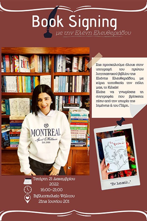 Το Βιβλιοπωλείο Ψάλτου σε συνεργασία με την συγγραφέα που έκανε γνωστό το Κιλκίς μέσα από το βιβλίο της, Ελένη Ελευθεριάδου, σας προσκαλεί 21/12/2022 στον χώρο του για ένα απόγευμα γεμάτο στιγμές «Εν Λευκώ».