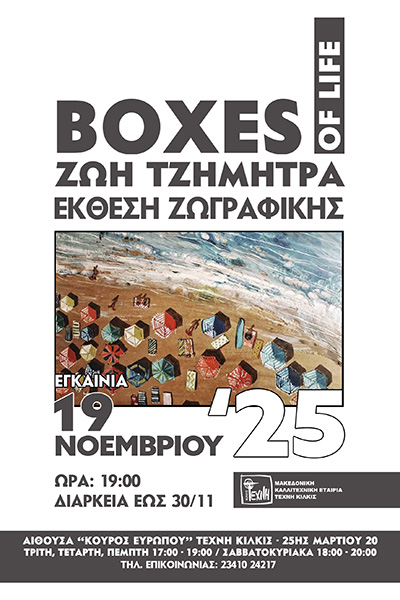 Η έκθεση θα διαρκέσει από 19 ως 30 Νοεμβρίου 2025 στην αίθουσα Κούρος Ευρωπού της Μ.Κ.Ε. Τέχνης Κιλκίς και τα εγκαίνια θα γίνουν την Τετάρτη 19 Νοεμβρίου στις 7 μ.μ., όπου το έργο της Ζωής θα προλογίσει ο Γιώργος Λιαμάδης αρχιτέκτονας και καθηγητής του τμήματος εικαστικών και εφαρμοσμένων τεχνών του Α.Π.Θ.