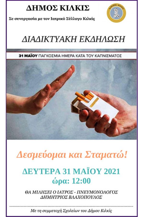 Τη Δευτέρα 31 Μαϊου, διεθνή ημέρα κατά του καπνίσματος, στις 12:00 έχει προγραμματιστεί διαδικτυακή εκδήλωση με τη συμμετοχή μαθητών από σχολεία της Δευτεροβάθμιας Εκπαίδευσης Κιλκίς.