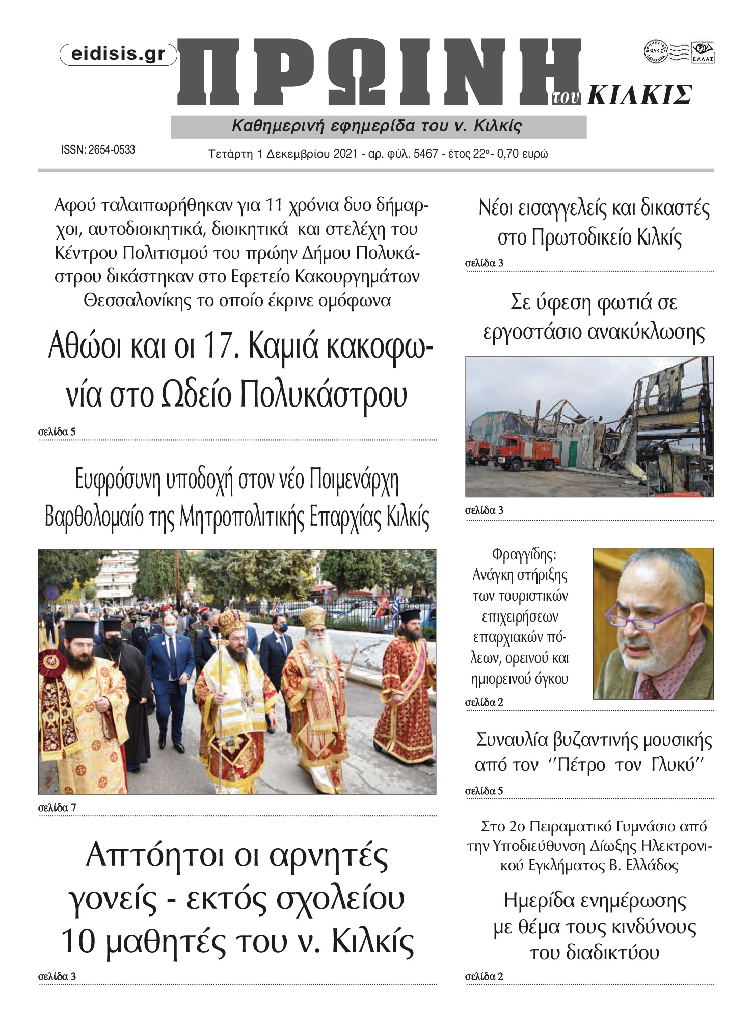 Διαβάστε το νέο πρωτοσέλιδο της Πρωινής του Κιλκίς, μοναδικής καθημερινής εφημερίδας του ν. Κιλκίς (1-12-2021)