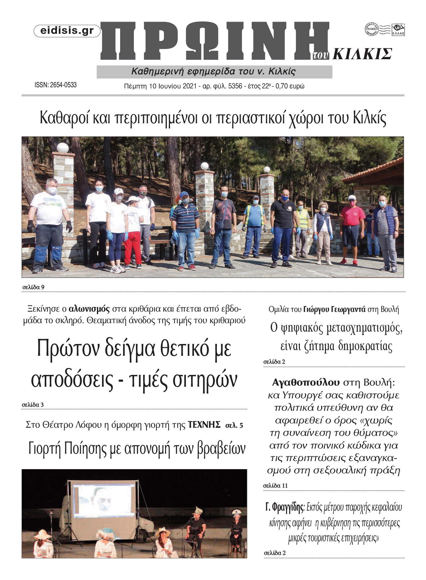 Διαβάστε το νέο πρωτοσέλιδο της Πρωινής του Κιλκίς, μοναδικής καθημερινής εφημερίδας του ν. Κιλκίς (10-6-2021)