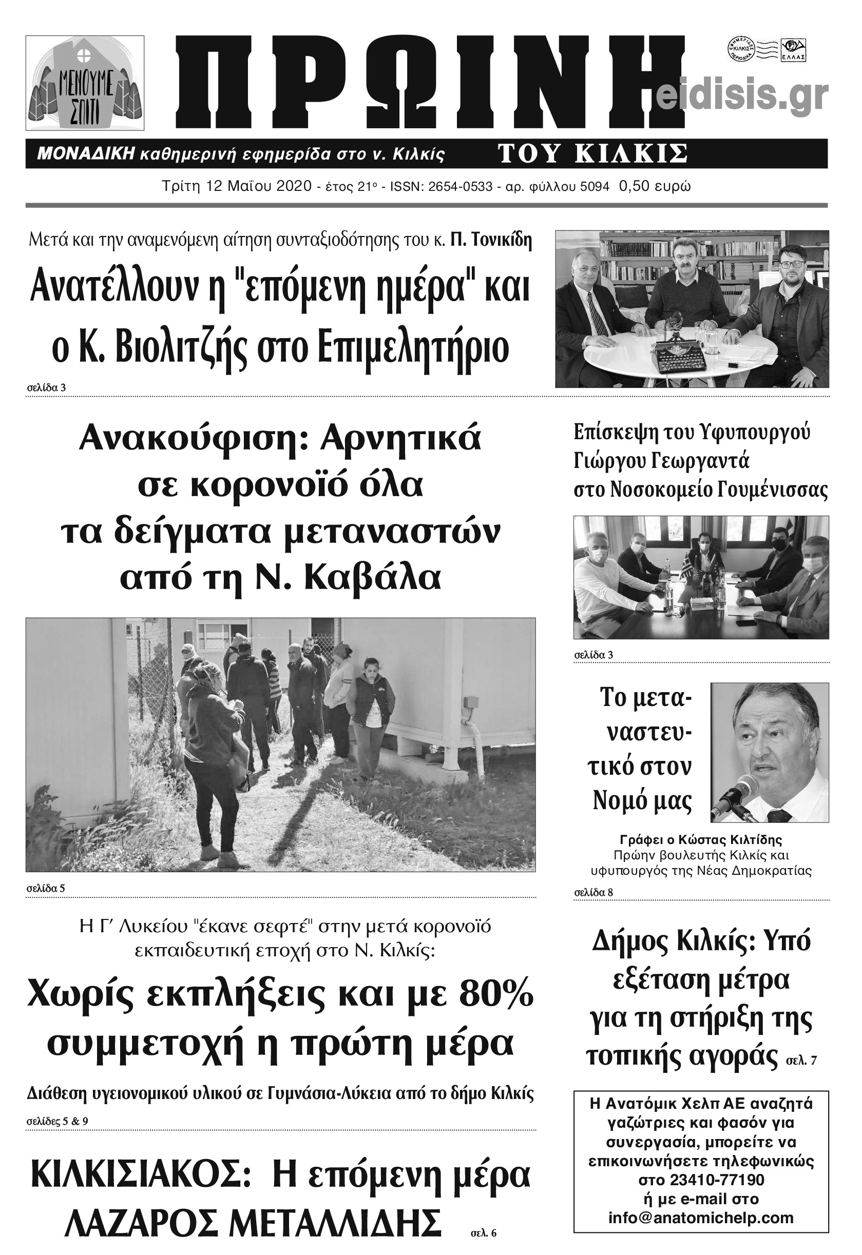 Διαβάστε το νέο πρωτοσέλιδο της Πρωινής του Κιλκίς, μοναδικής καθημερινής εφημερίδας του ν. Κιλκίς (12-5-2020)