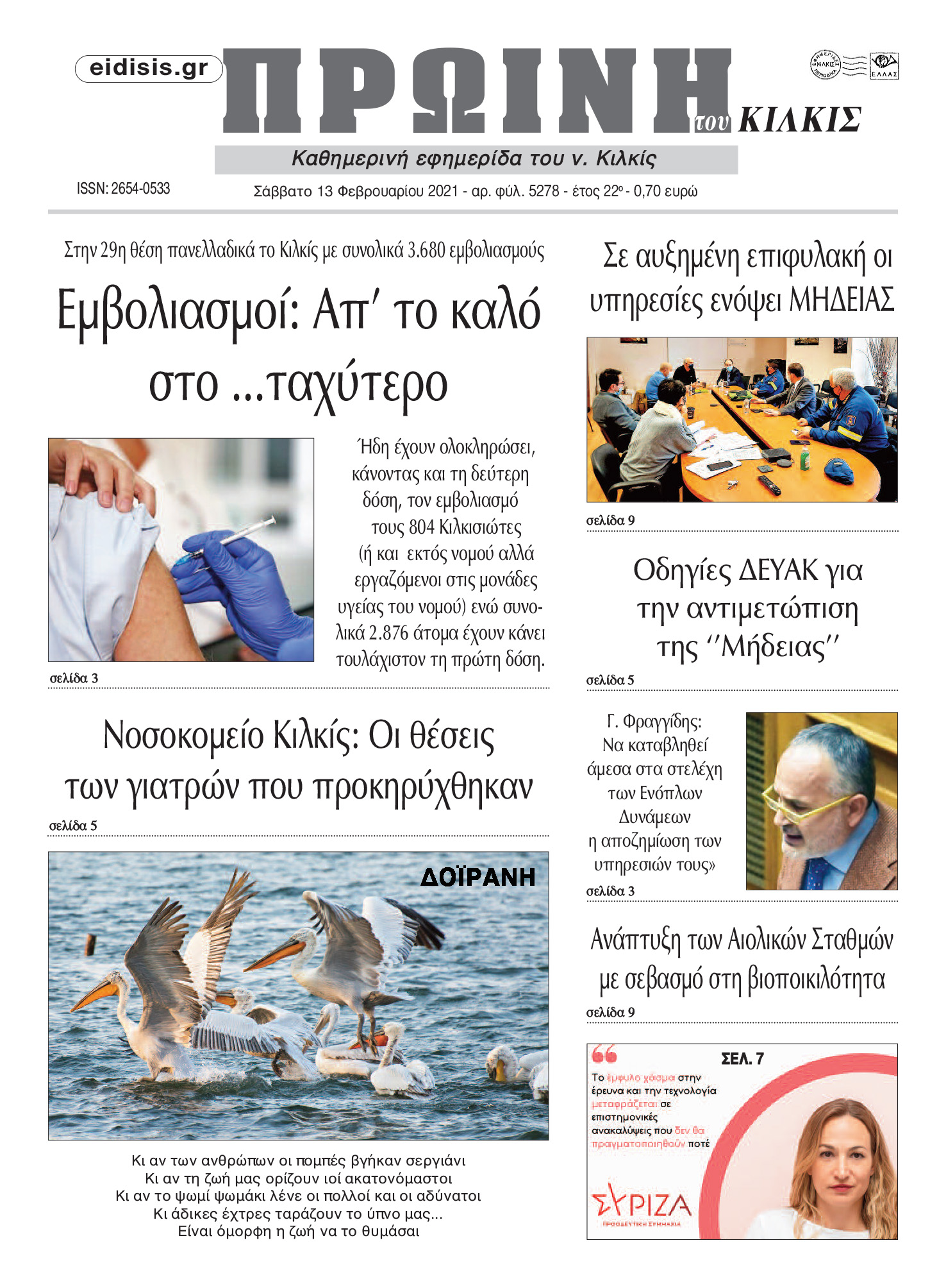 Διαβάστε το νέο πρωτοσέλιδο της Πρωινής του Κιλκίς, μοναδικής καθημερινής εφημερίδας του ν. Κιλκίς (13-2-2021)