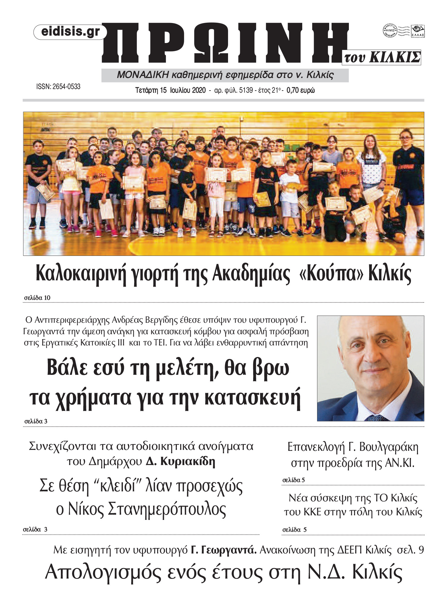 Διαβάστε το νέο πρωτοσέλιδο της Πρωινής του Κιλκίς, μοναδικής καθημερινής εφημερίδας του ν. Κιλκίς (15-7-2020)