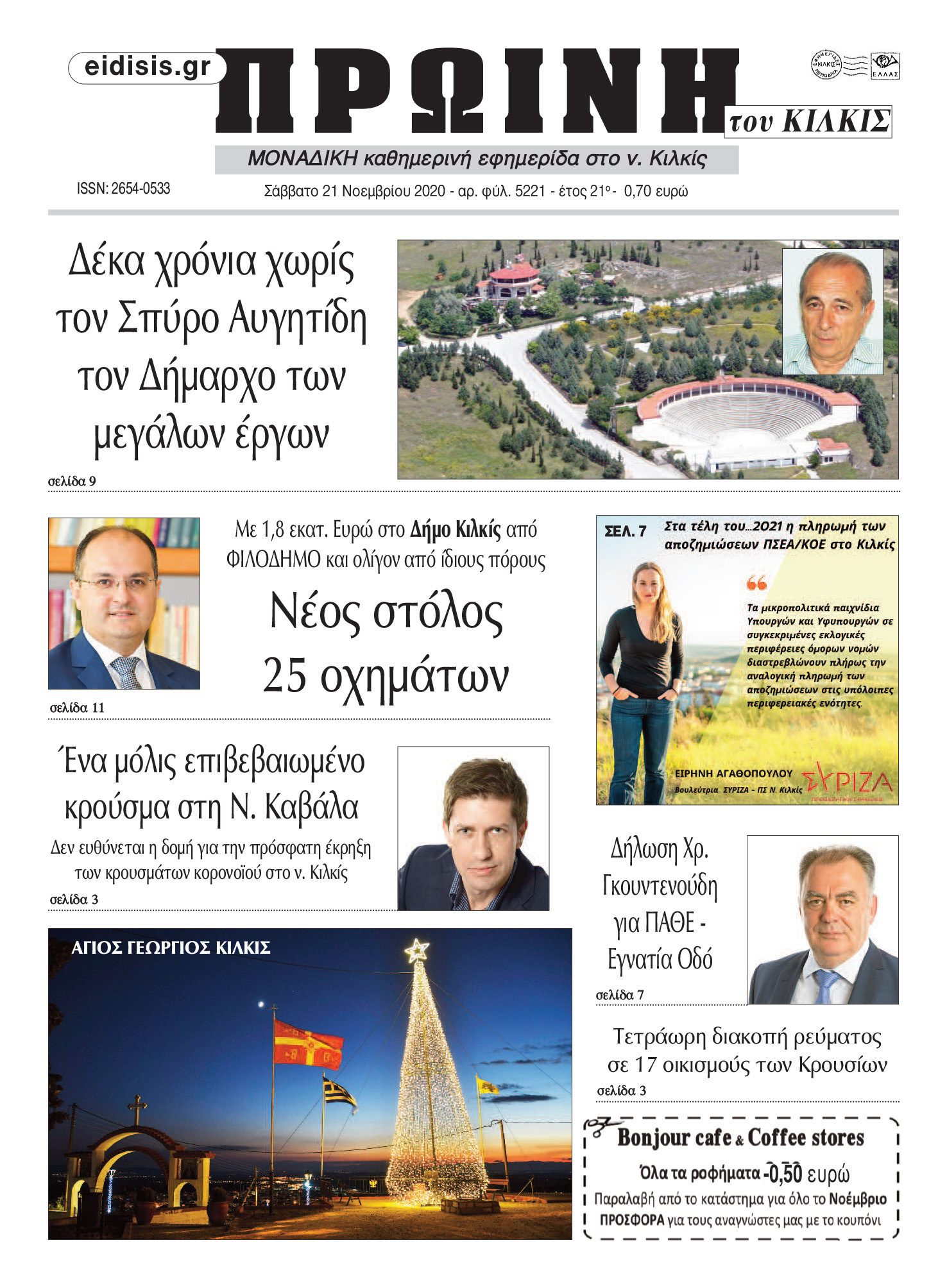 Διαβάστε το νέο πρωτοσέλιδο της Πρωινής του Κιλκίς, μοναδικής καθημερινής εφημερίδας του ν. Κιλκίς (21-11-2020)