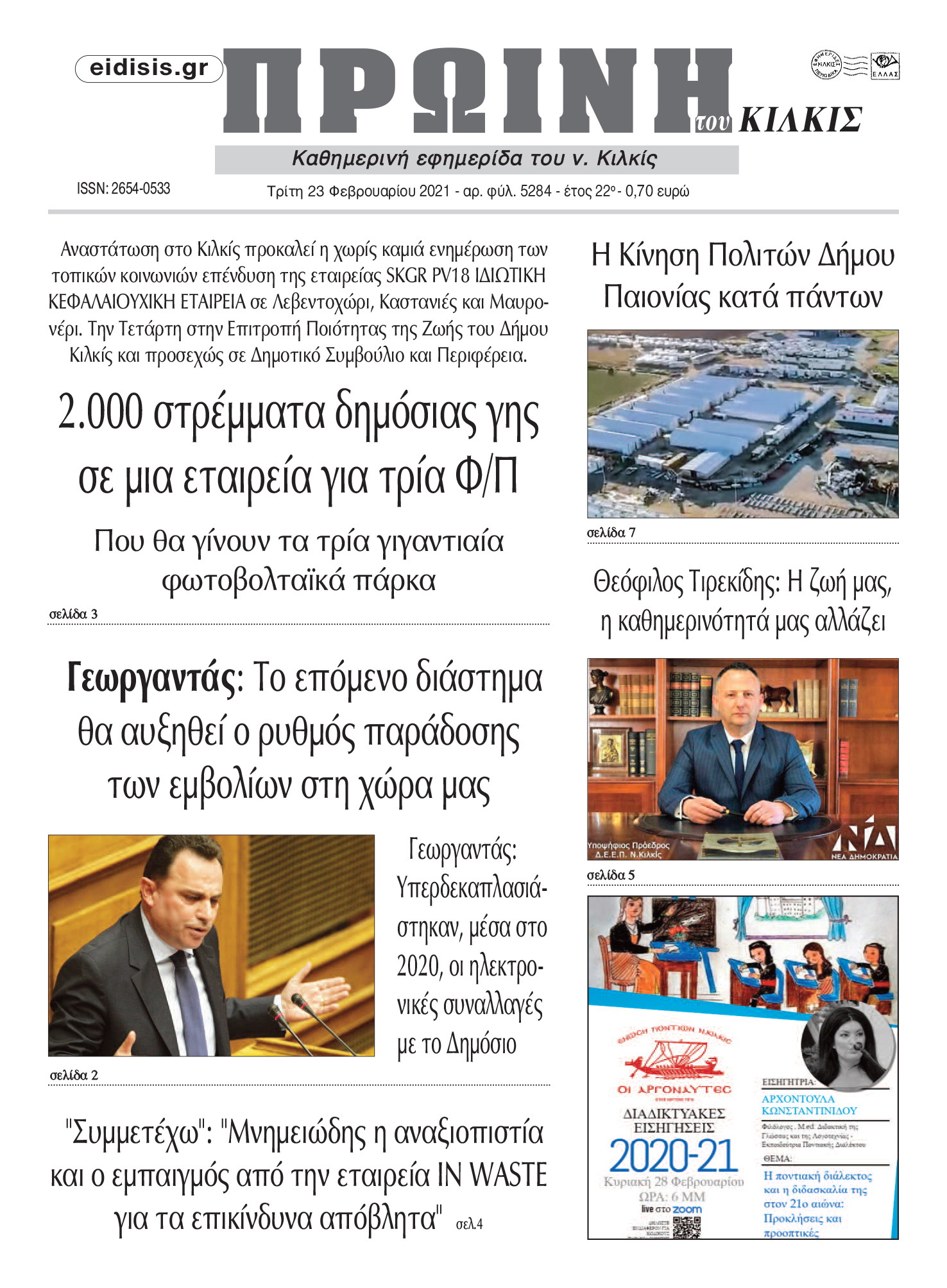 Διαβάστε το νέο πρωτοσέλιδο της Πρωινής του Κιλκίς, μοναδικής καθημερινής εφημερίδας του ν. Κιλκίς (23-2-2021)