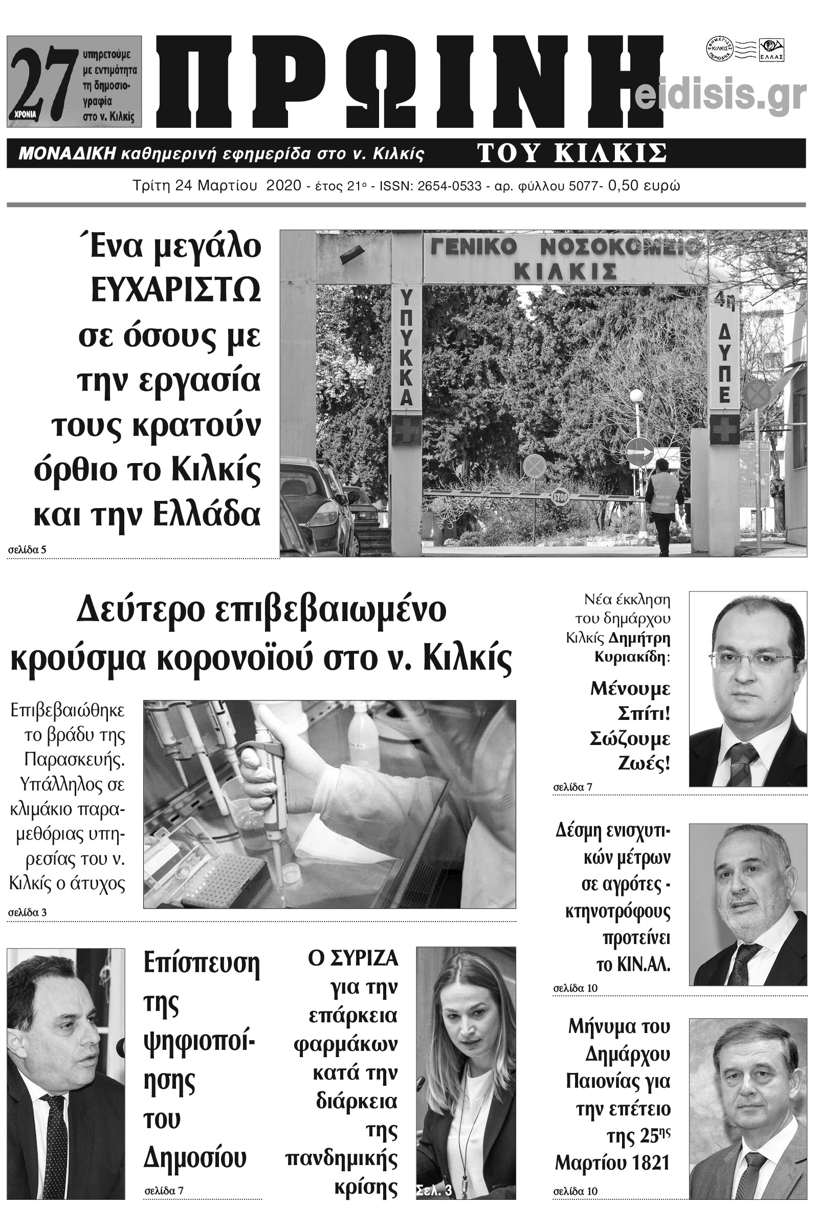 Διαβάστε το νέο πρωτοσέλιδο της Πρωινής του Κιλκίς, μοναδικής καθημερινής εφημερίδας του ν. Κιλκίς (24-3-20)