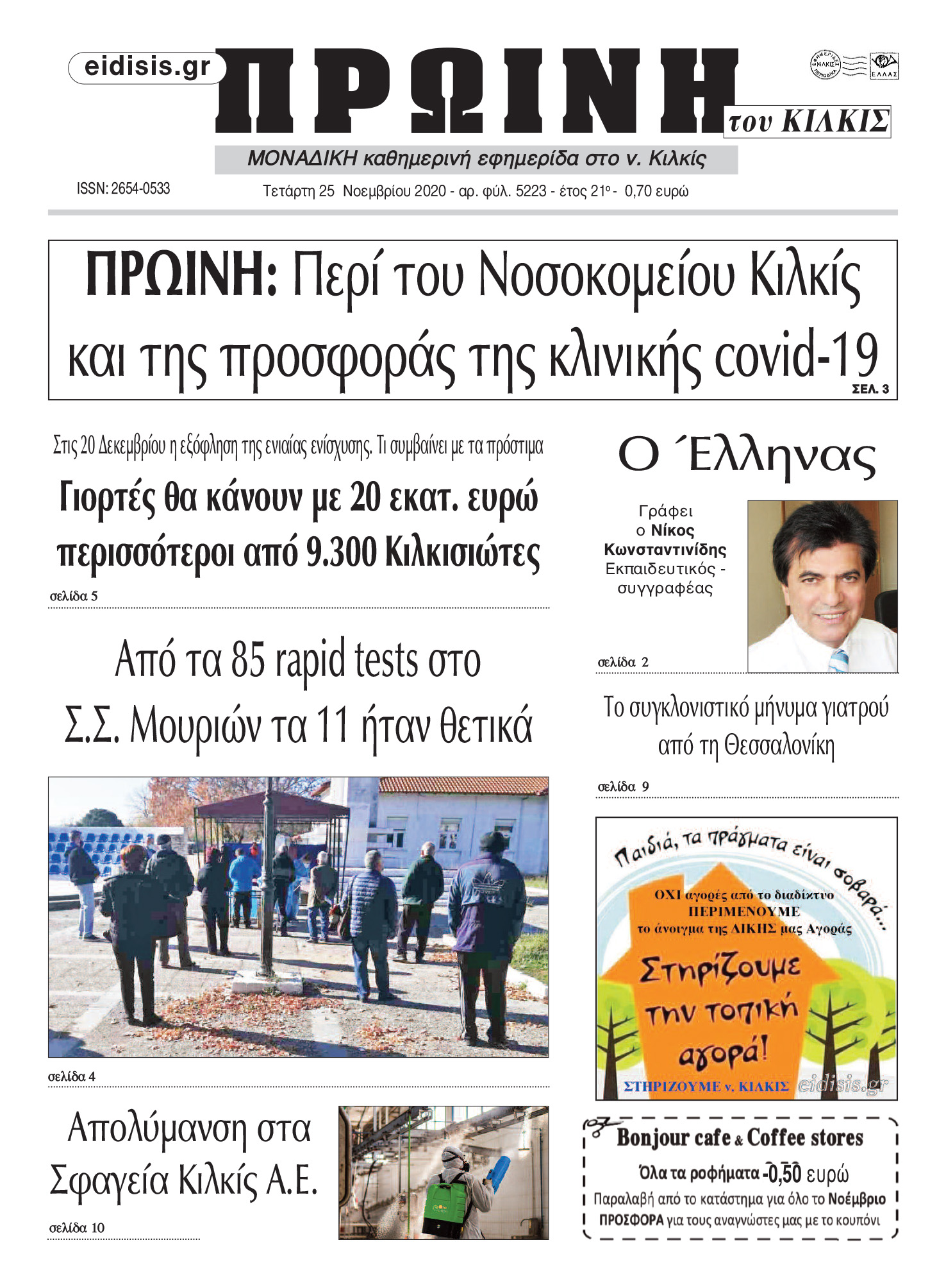 Διαβάστε το νέο πρωτοσέλιδο της Πρωινής του Κιλκίς, μοναδικής καθημερινής εφημερίδας του ν. Κιλκίς (25-11-2020)