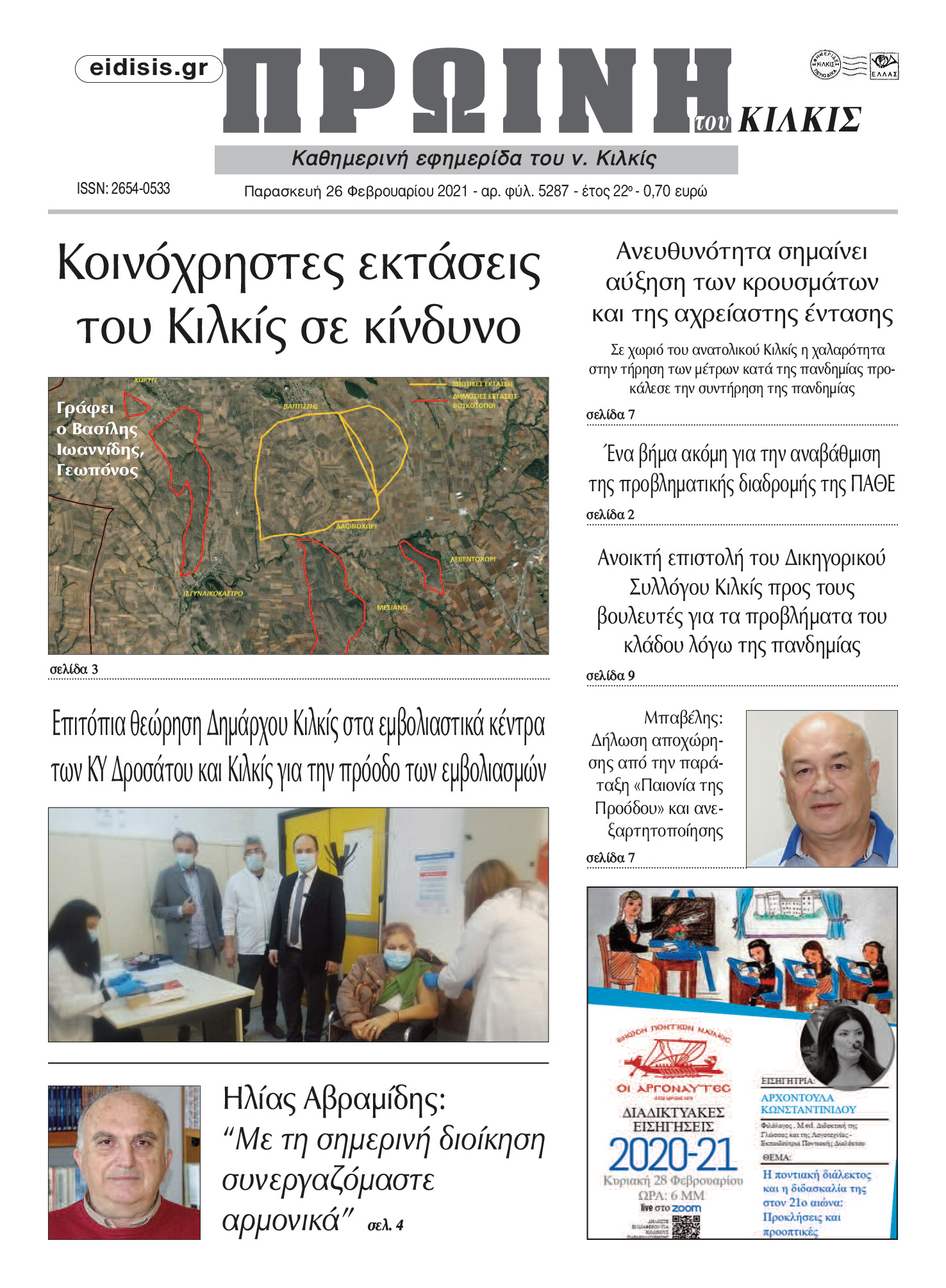 Διαβάστε το νέο πρωτοσέλιδο της Πρωινής του Κιλκίς, μοναδικής καθημερινής εφημερίδας του ν. Κιλκίς (26-2-2021)