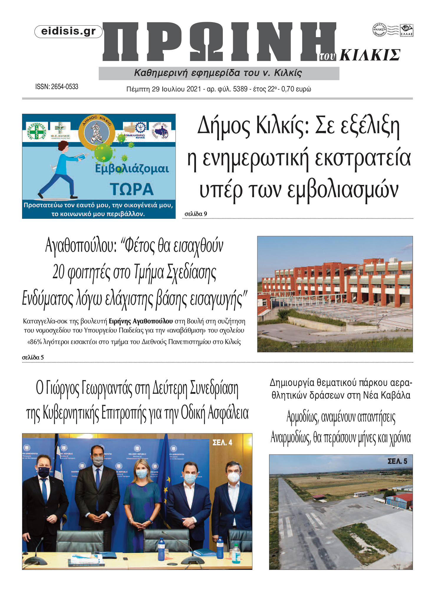 Διαβάστε το νέο πρωτοσέλιδο της Πρωινής του Κιλκίς, μοναδικής καθημερινής εφημερίδας του ν. Κιλκίς (29-7-2021)