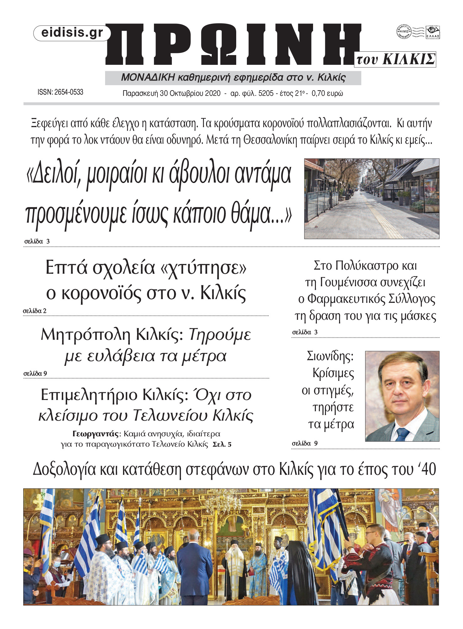 Διαβάστε το νέο πρωτοσέλιδο της Πρωινής του Κιλκίς, μοναδικής καθημερινής εφημερίδας του ν. Κιλκίς (30-10-2020)