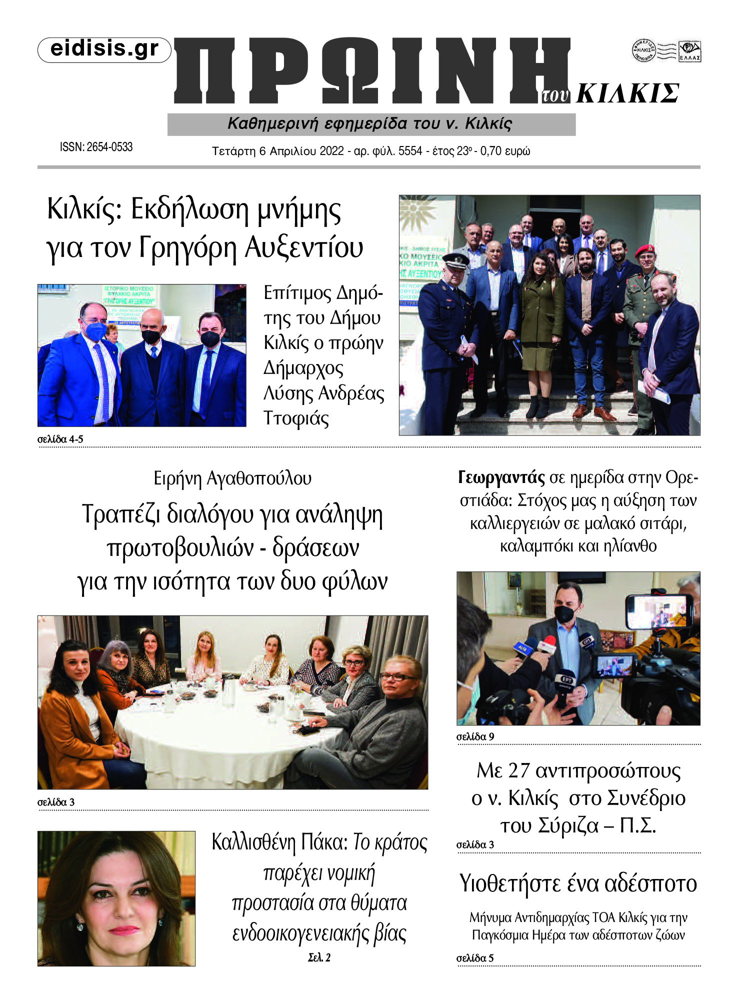 Διαβάστε το νέο πρωτοσέλιδο της Πρωινής του Κιλκίς, μοναδικής καθημερινής εφημερίδας του ν. Κιλκίς (6-4-2022)