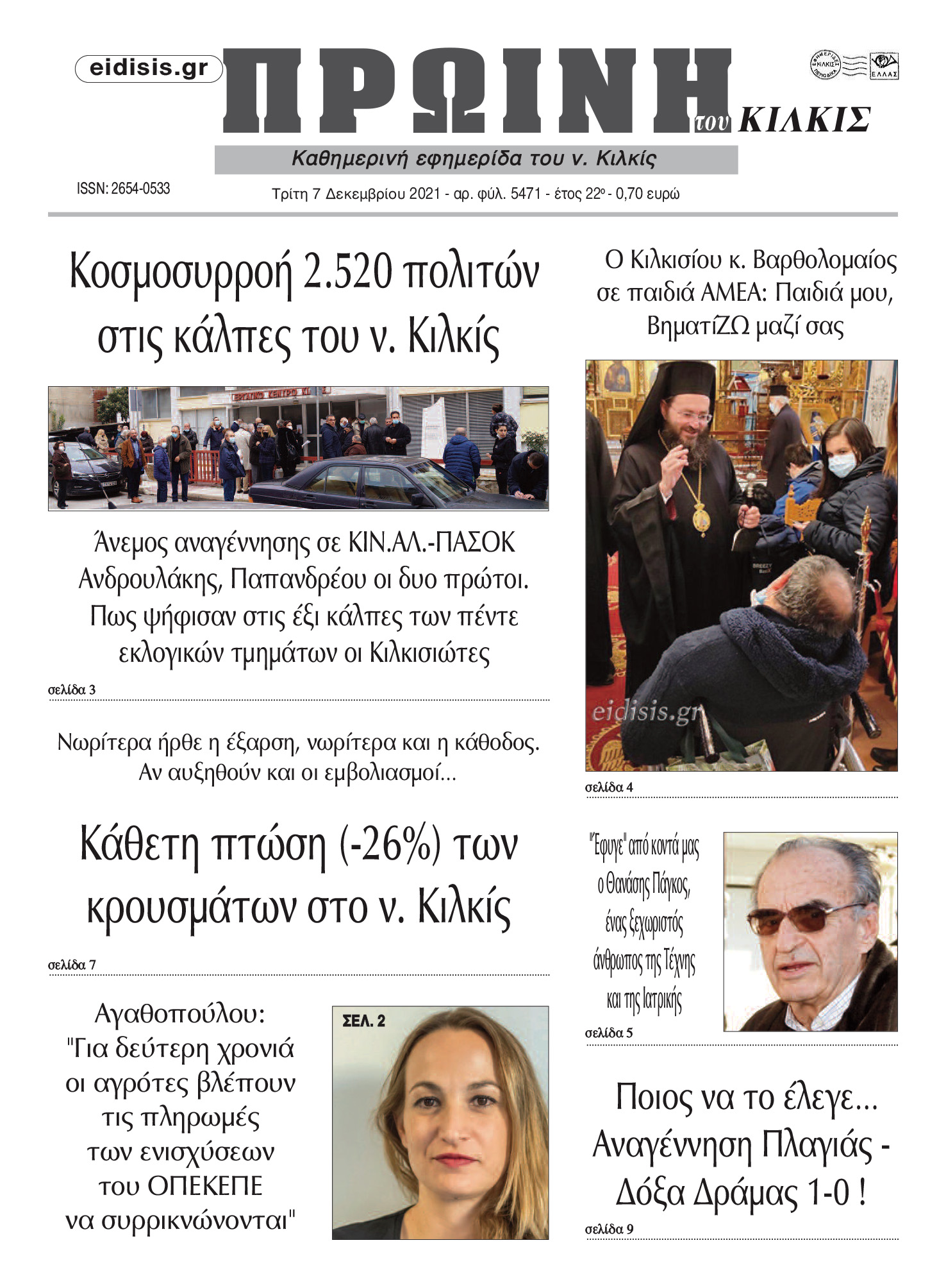 Διαβάστε το νέο πρωτοσέλιδο της Πρωινής του Κιλκίς, μοναδικής καθημερινής εφημερίδας του ν. Κιλκίς (7-12-2021)