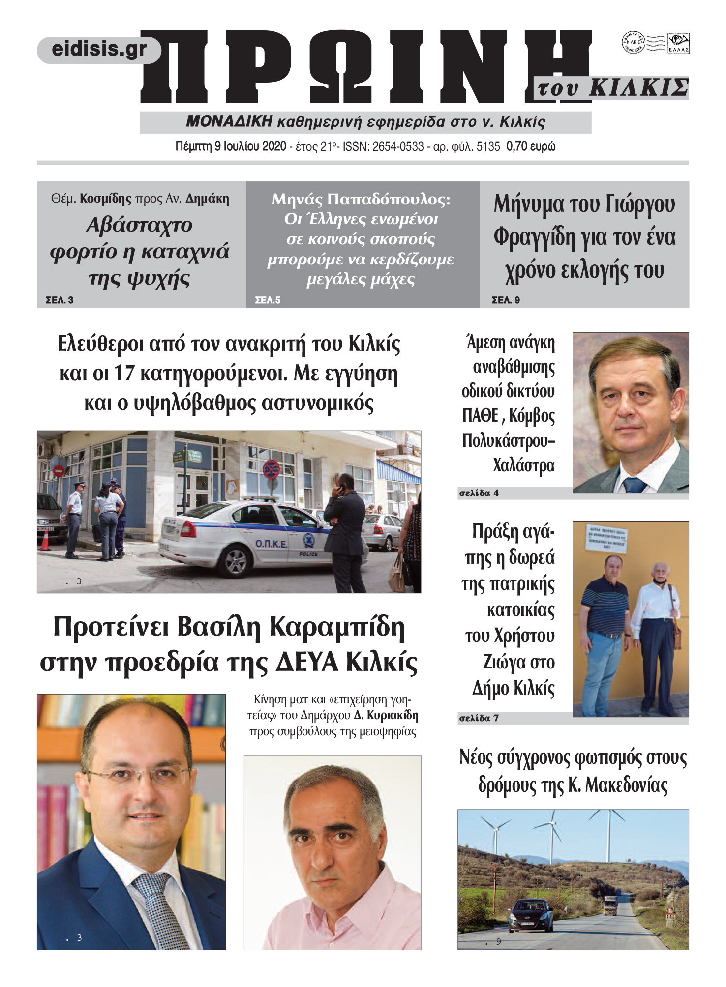 Διαβάστε το νέο πρωτοσέλιδο της Πρωινής του Κιλκίς, μοναδικής καθημερινής εφημερίδας του ν. Κιλκίς (9-7-2020)