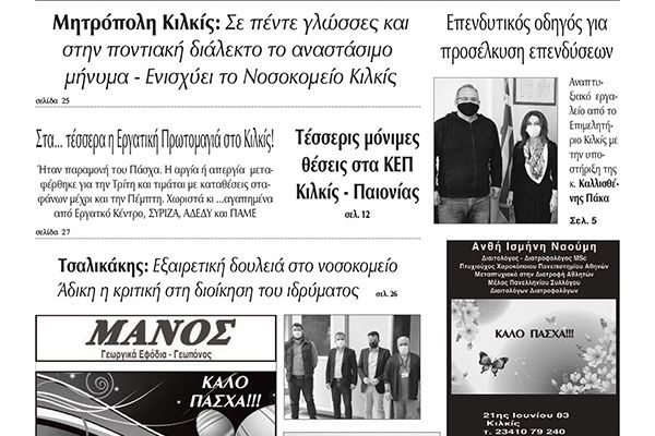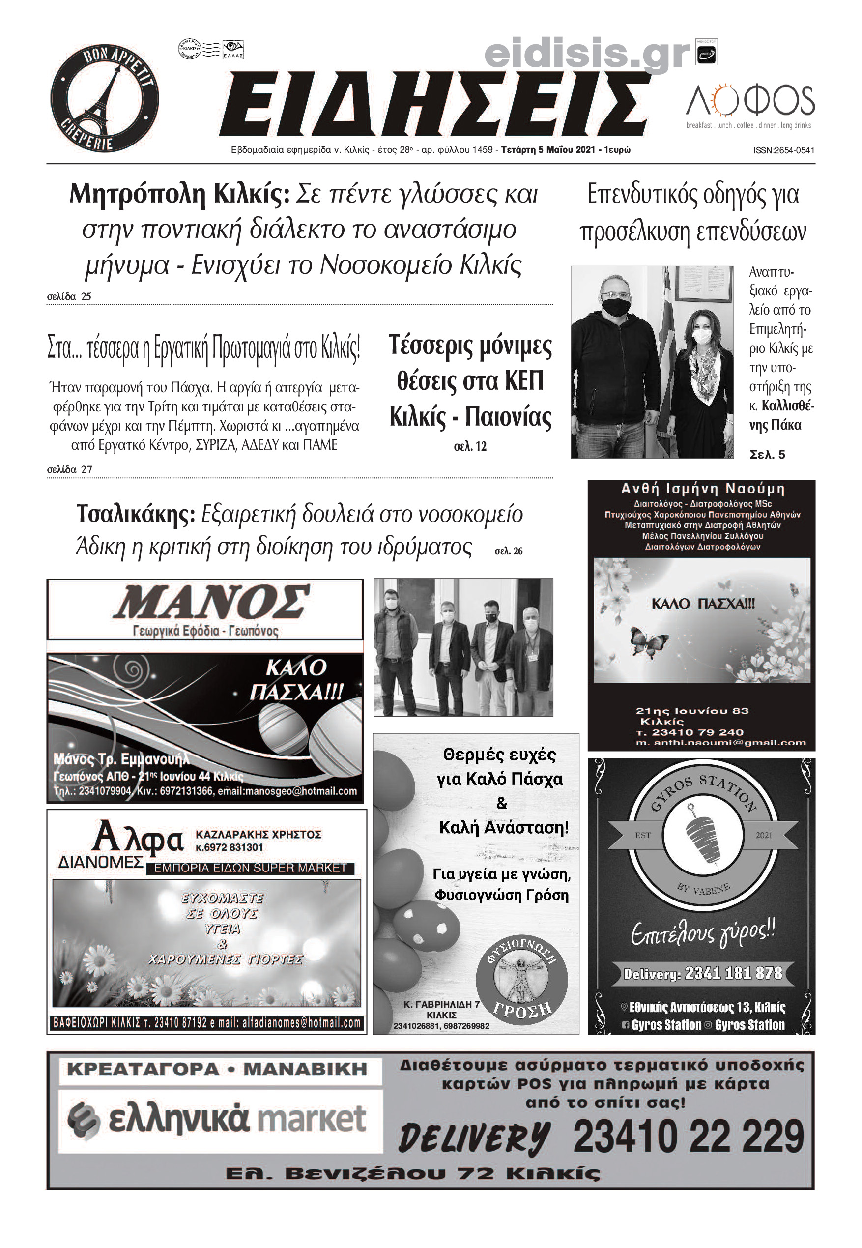 Διαβάστε το νέο πρωτοσέλιδο των ΕΙΔΗΣΕΩΝ, της εβδομαδιαίας εφημερίδας του ν. Κιλκίς (5-5-2021)