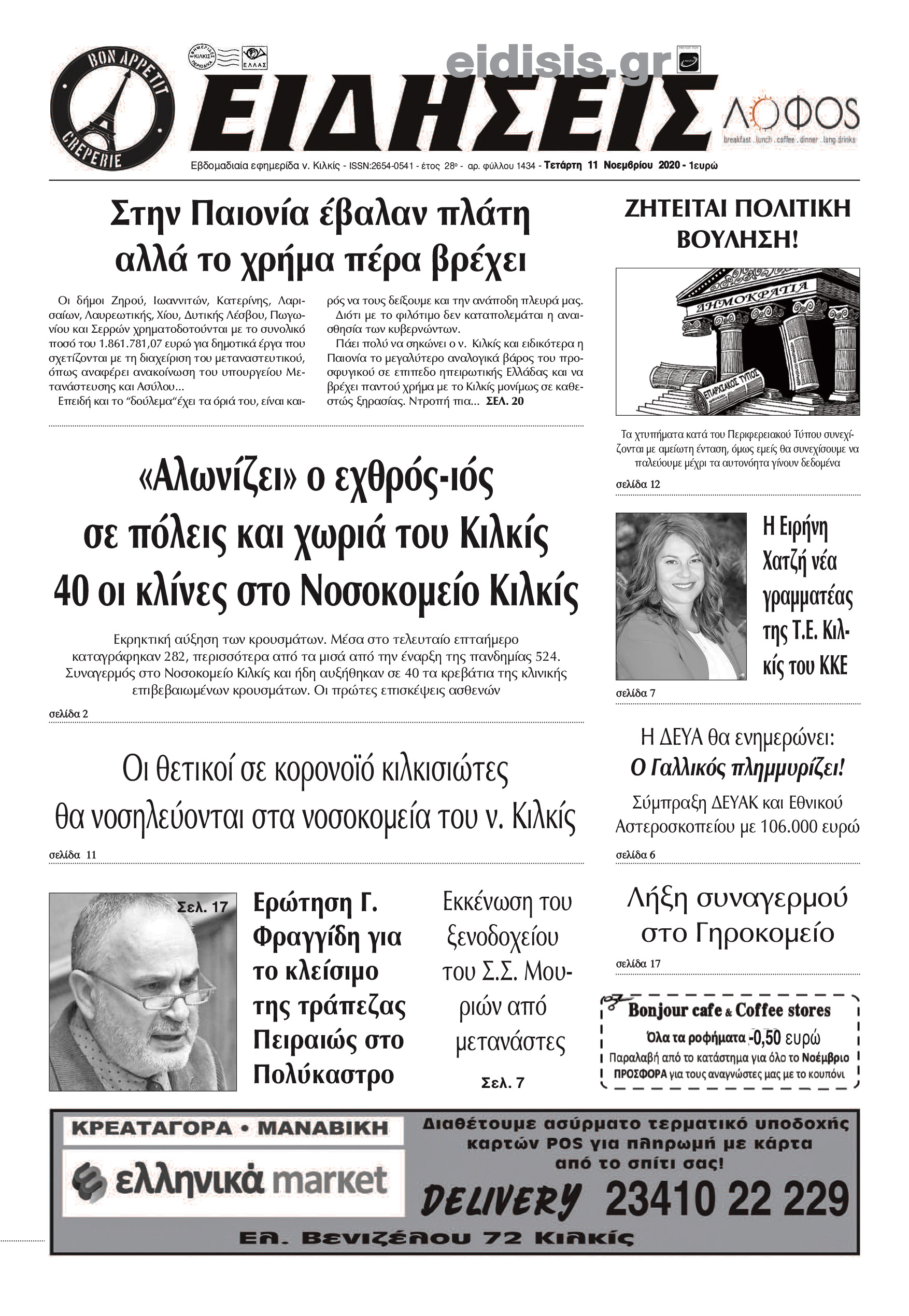 Διαβάστε το νέο πρωτοσέλιδο των ΕΙΔΗΣΕΩΝ του Κιλκίς, της εβδομαδιαίας εφημερίδας του ν. Κιλκίς (11-11-2020)