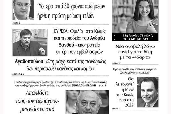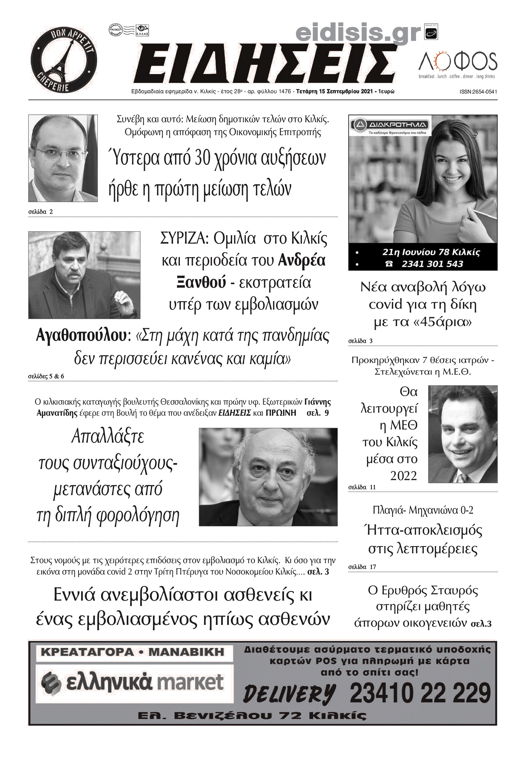 Διαβάστε το νέο πρωτοσέλιδο των ΕΙΔΗΣΕΩΝ του Κιλκίς, της εβδομαδιαίας εφημερίδας του ν. Κιλκίς (15-9-2021)