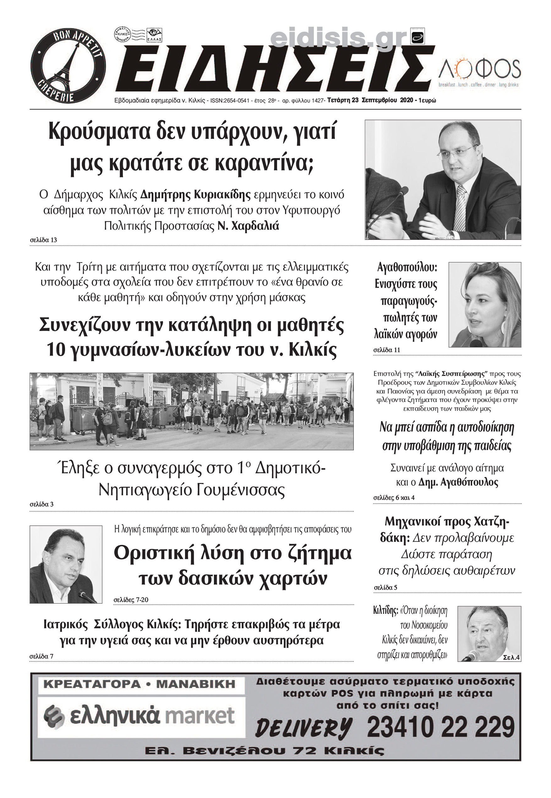 Διαβάστε το νέο πρωτοσέλιδο των ΕΙΔΗΣΕΩΝ του Κιλκίς, της εβδομαδιαίας εφημερίδας του ν. Κιλκίς (23-9-2020)
