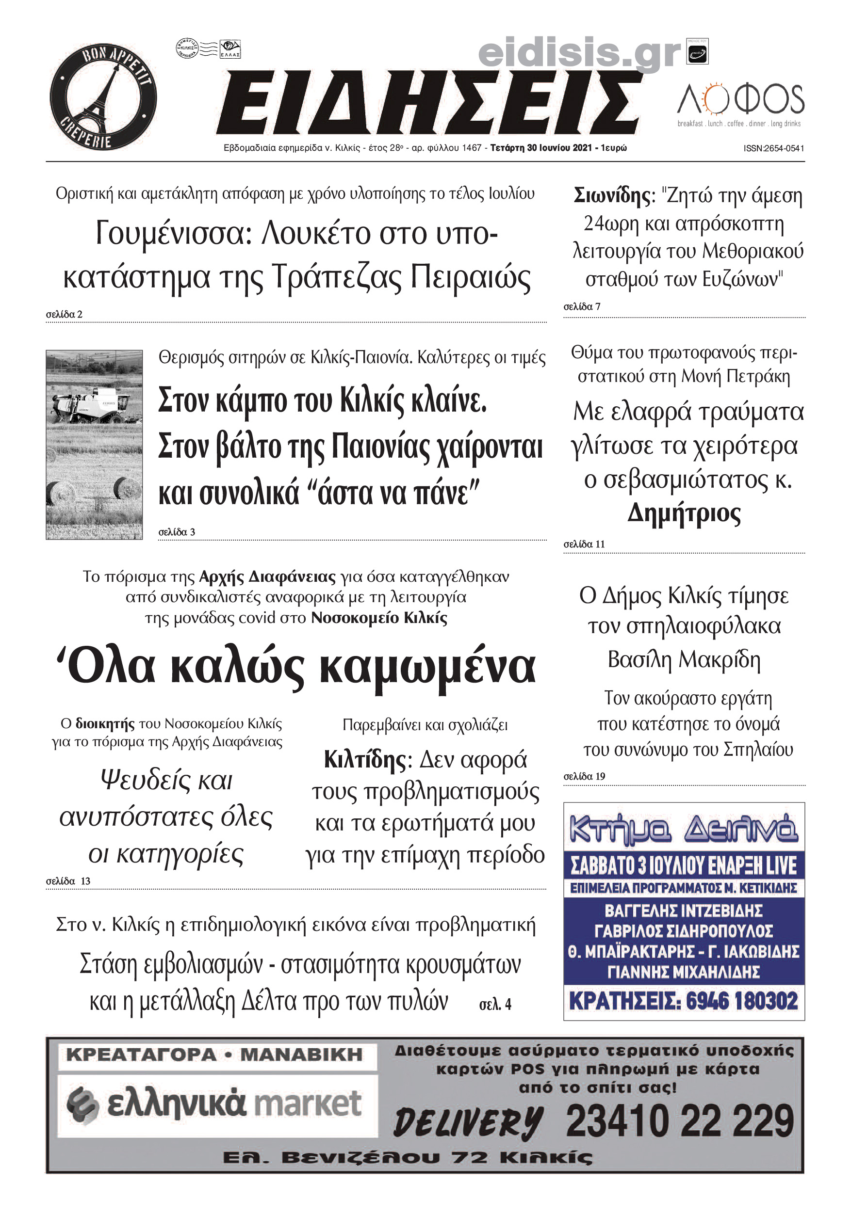 Διαβάστε το νέο πρωτοσέλιδο των ΕΙΔΗΣΕΩΝ του Κιλκίς, της εβδομαδιαίας εφημερίδας του ν. Κιλκίς (30-6-2021)