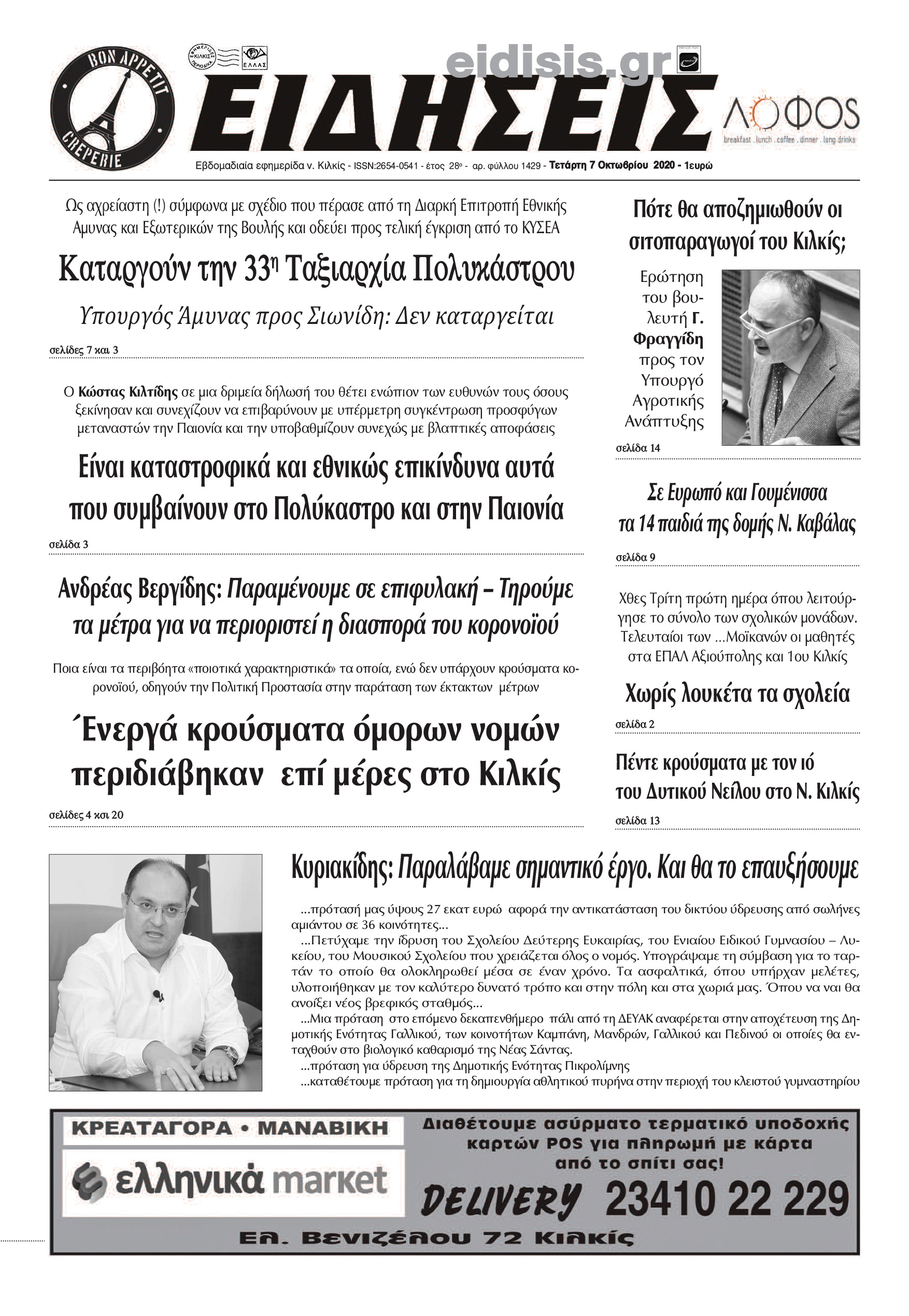 Διαβάστε το νέο πρωτοσέλιδο των ΕΙΔΗΣΕΩΝ του Κιλκίς, της εβδομαδιαίας εφημερίδας του ν. Κιλκίς (7-10-2020)