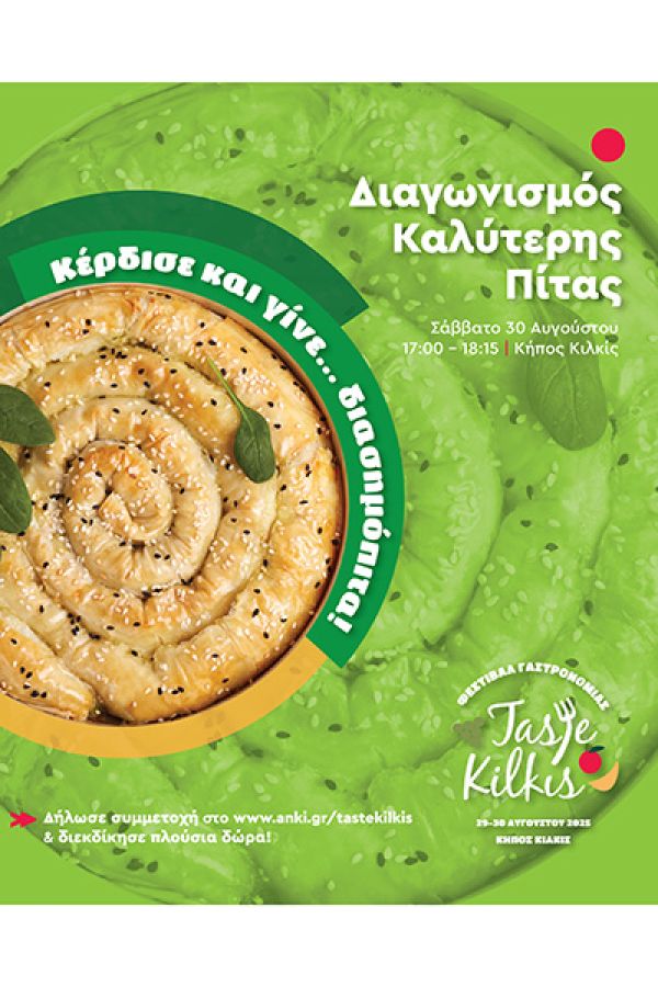 Ένας μοναδικός διαγωνισμός για την καλύτερη πίτα στο ν. Κιλκίς θα διεξαχθεί στο πλαίσιο του Φεστιβάλ Γαστρονομίας “Taste Kilkis” που διοργανώνει ο δήμος Κιλκίς και η Αναπτυξιακή Κιλκίς. Φέρτε την αγαπημένη σας συνταγή, παρουσιάστε τη δική σας ξεχωριστή πίτα, διεκδικήστε τον τίτλο: «Καλύτερη Πίτα 2025» και γίνετε μια …διασημόπιτα.