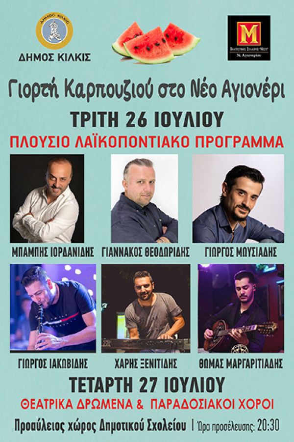 Στον προαύλιο χώρο του Δημοτικού Σχολείου Νέου Αγιονερίου οι κάτοικοι και οι επισκέπτες θα απολαύσουν την τοπική παραγωγή. Ολόδροσες φέτες καρπουζιού θα διατίθενται δωρεάν στο κοινό αλλά και ολόκληρα καρπούζια θα ζυγιστούν σε μίνι διαγωνισμό για την ανάδειξη του βαρύτερου καρπουζιού. Κατά τη διάρκεια του διημέρου οι γεύσεις θα συναντηθούν με τραγούδι, θεατρικό δρώμενο και παραδοσιακούς χορούς.