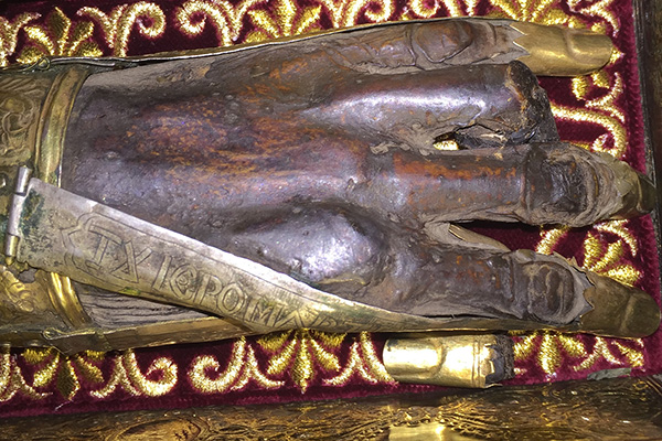 Ψάλλοντας όλοι τροπάρια του μεγάλου Αγίου, υποδέχθηκαν το ιερό λείψανο του άφθαρτου αριστερού χεριού του αγίου Χαραλάμπους από την ιστορική Μονή της Παναγίας του Μεγάλου Σπηλαίου (4ος η 9ος αι., κατά το Ιστορικό της Μονής).