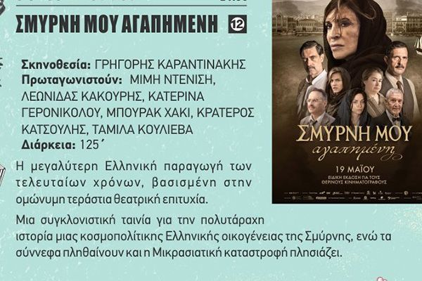 Η ‘’Σμύρνη μου αγαπημένη’’ θα επαναπροβληθεί την Κυριακή 17 Ιουλίου και την Τρίτη 19 Ιουλίου στις 21:30. Πρόκειται για την ακριβότερη ελληνική κινηματογραφική παραγωγή με ένα λαμπρό καστ ηθοποιών, που με αφορμή τη σύγχρονη όψη του προσφυγικού ζητήματος, μεταφέρει το κοινό στην πολύβουη Σμύρνη, στις αριστοκρατικές συνοικίες της αλλά και στη δραματική έξοδο του ελληνικού πληθυσμού της στην προσφυγιά μετά την κατάρρευση του στρατιωτικού μετώπου.