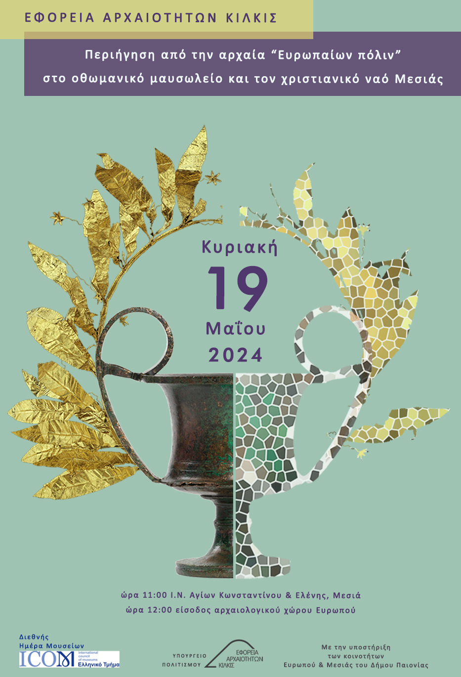 - Ώρα 11.00 Στη Μεσιά, στο μαυσωλείο (turbe) μουσουλμάνου αγίου (baba), που, με σεβασμό στην ιστορία του, σήμερα λειτουργεί ως χριστιανικός ναός των Αγίων Κωνσταντίνου και Ελένης, θα αφηγηθούμε την ιστορία ενός μνημείου από την ύπαιθρο χώρα της αρχαίας Ευρωπού έως τη σημερινή εποχή.