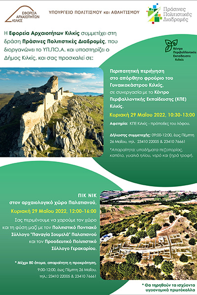 Η δράση αφορά ενήλικες και θα πραγματοποιηθεί στο βυζαντινό φρούριο Γυναικοκάστρου σε συνεργασία με το Κέντρο Περιβαλλοντικής Εκπαίδευσης (ΚΠΕ) και την υποστήριξη του Δήμου Κιλκίς. Αφετηρία το Κ.Π.Ε., στους πρόποδες του λόφου, με κατεύθυνση το βυζαντινό φρούριο και σύντομες στάσεις κατόπτευσης του περιβάλλοντος χώρου και των μνημείων του, όπως ο ταφικός τύμβος της Πρώιμης Εποχής Σιδήρου (10ος-9ος αι. π.Χ.). Δήλωση συμμετοχής έως Πέμπτη 26 Μαΐου (09:00-12:00), τηλ.: 23410 22005 & 23410 76661. Απαραίτητα: υποδήματα πεζοπορίας, καπέλο, γυαλιά ηλίου, νερό και ξηρά τροφή.