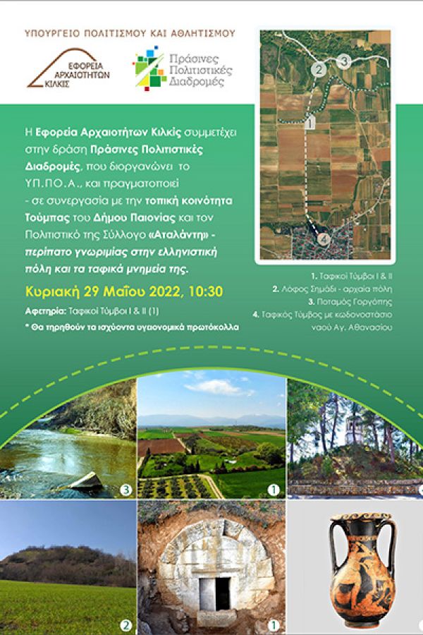 - Περίπατος γνωριμίας με την ελληνιστική πόλη και τα ταφικά μνημεία στην ΤΚ Τούμπας Δήμου Παιονίας, ώρα 10.30.